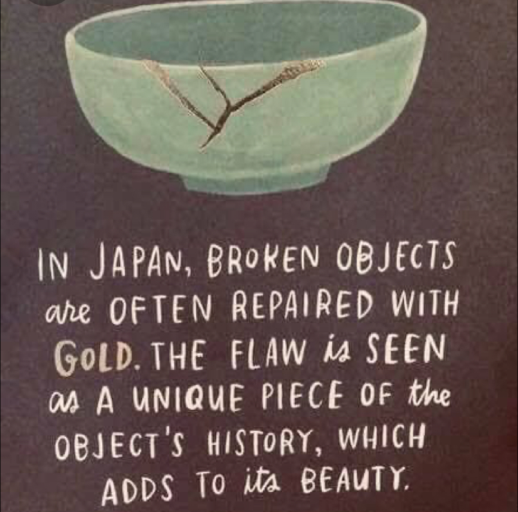 Ik las eens een verhaal over een oud gebruik in Japan, Kintsukuroi genaamd.  Daar is het een kunst om gebroken serviesgoed te herstellen. Niet alleen met lijm, maar elke barst krijgt een gouden randje. Zo krijgt elk gebroken kommetje iets unieks, iets wat het mooier maakt omdat het iets heeft meegemaakt.