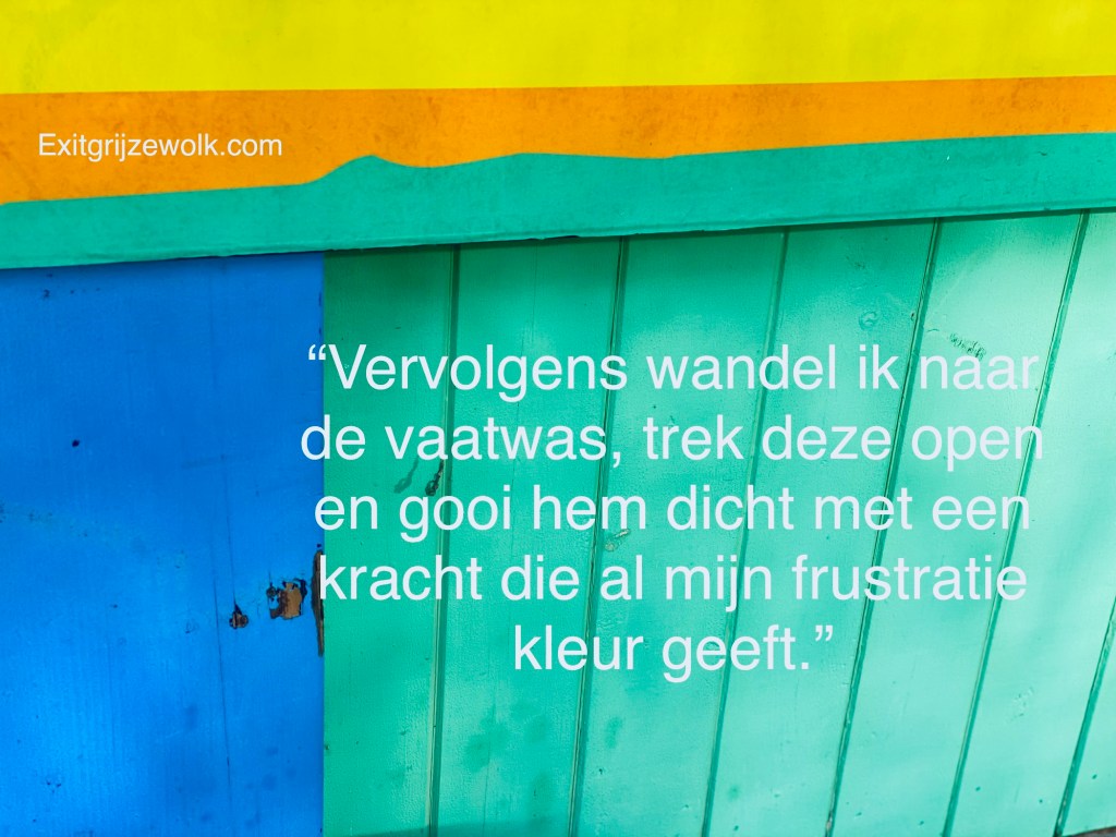 En dus, bijt ik mijn tong eraf en stop onze kleren in de wasmachine. Vervolgens wandel ik naar de vaatwas, trek deze open en gooi hem dicht met een kracht die al mijn frustratie kleur geeft. Jammer van dat kapotte glas, maar net daarom werd de kringwinkel in het leven geroepen denk ik dan.